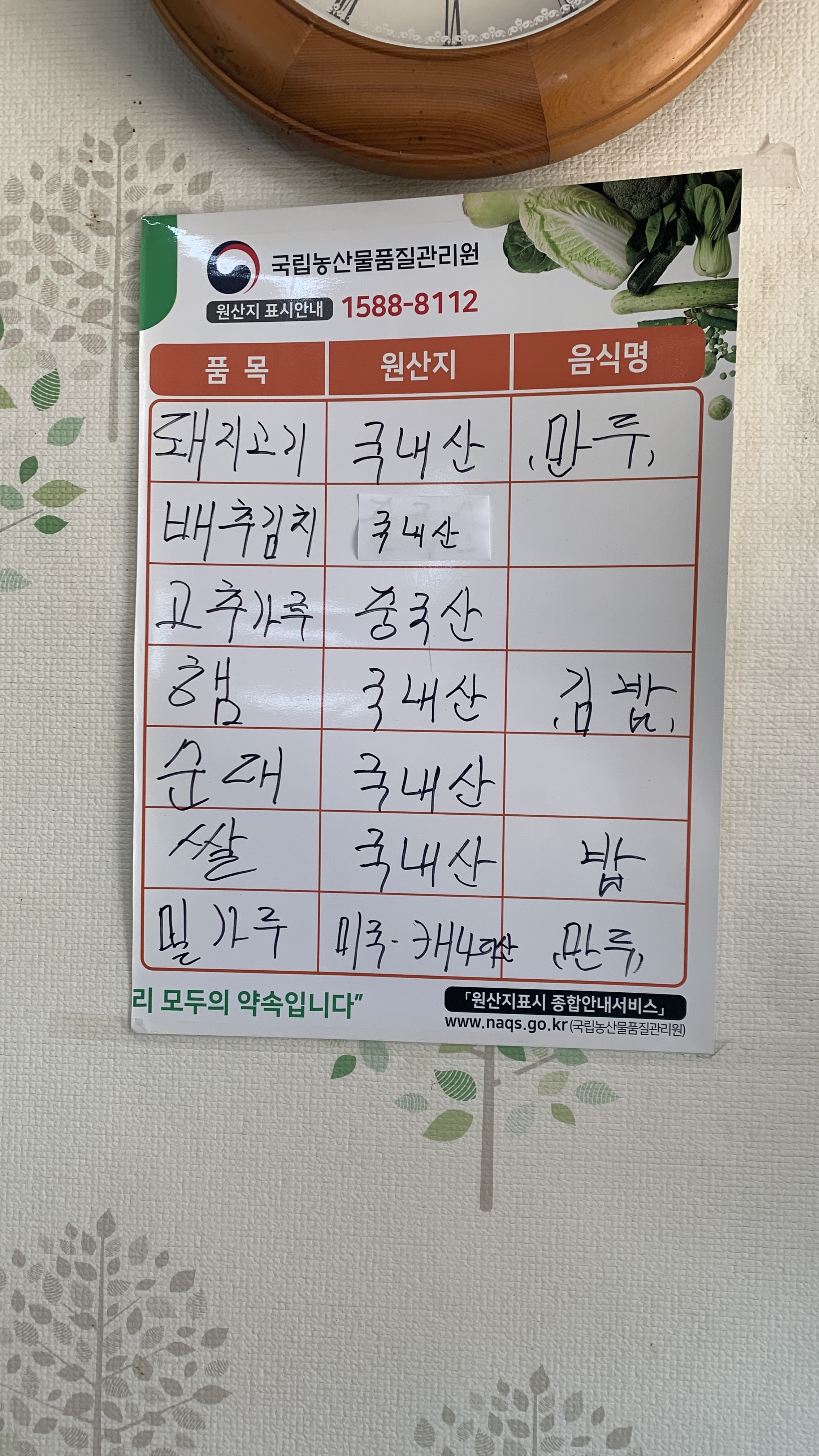 메뉴판은 이렇고 원산지 표기도 찍어봤다.